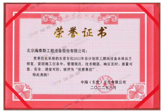 海泰斯獲評“優(yōu)質單位”!負責的催化裝置、常減壓裝置泄漏法蘭的在線修復和定力矩緊固施工任務,實現(xiàn)了“零泄漏”的目標。